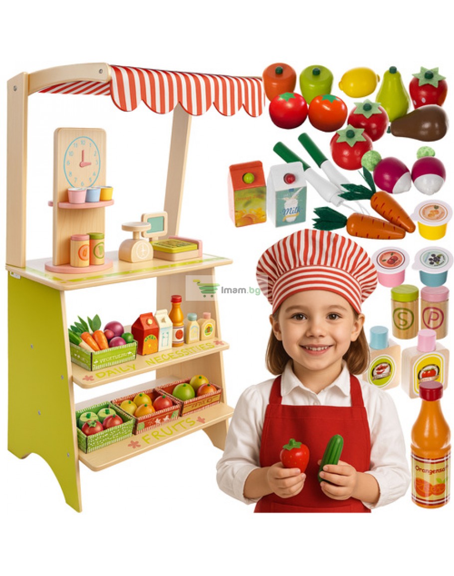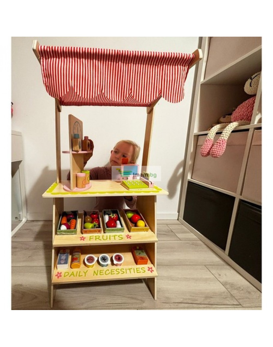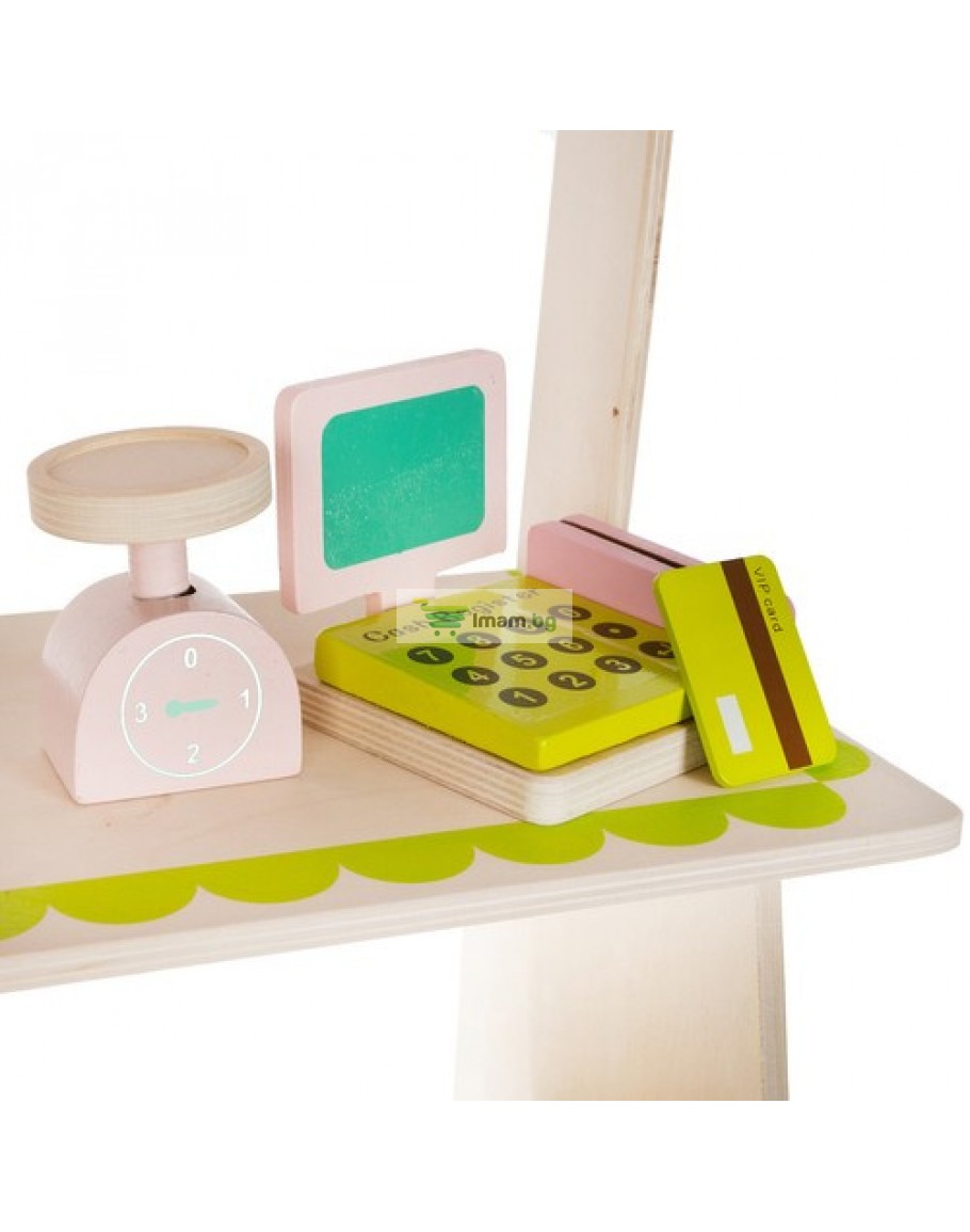 Дървен супермаркет за деца с касов апарат аксесоари и комплект плодове