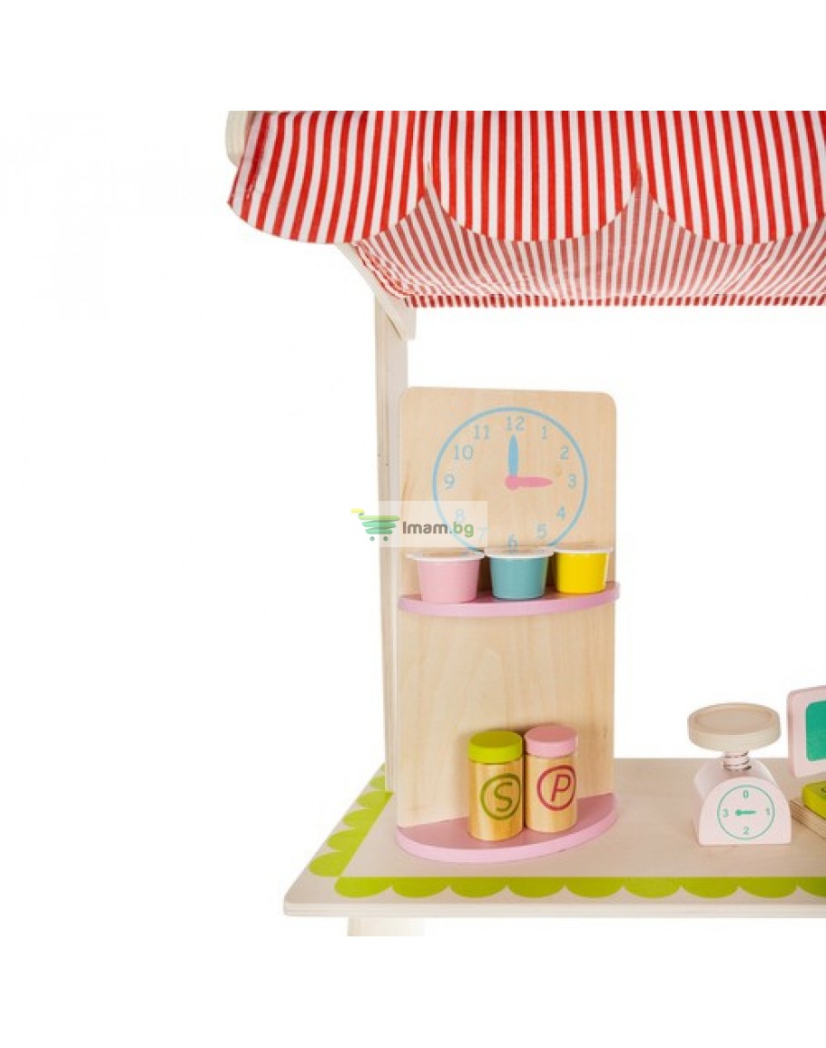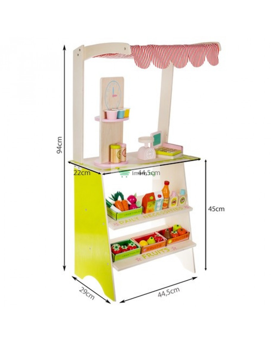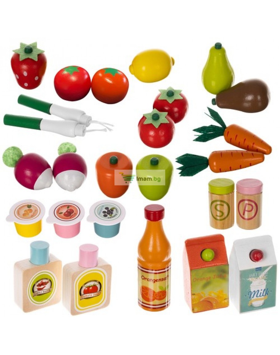 Дървен супермаркет за деца с касов апарат аксесоари и комплект плодове
