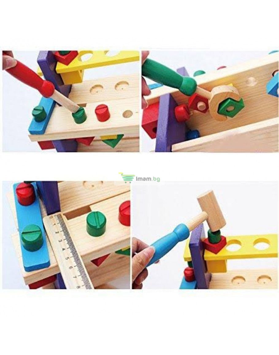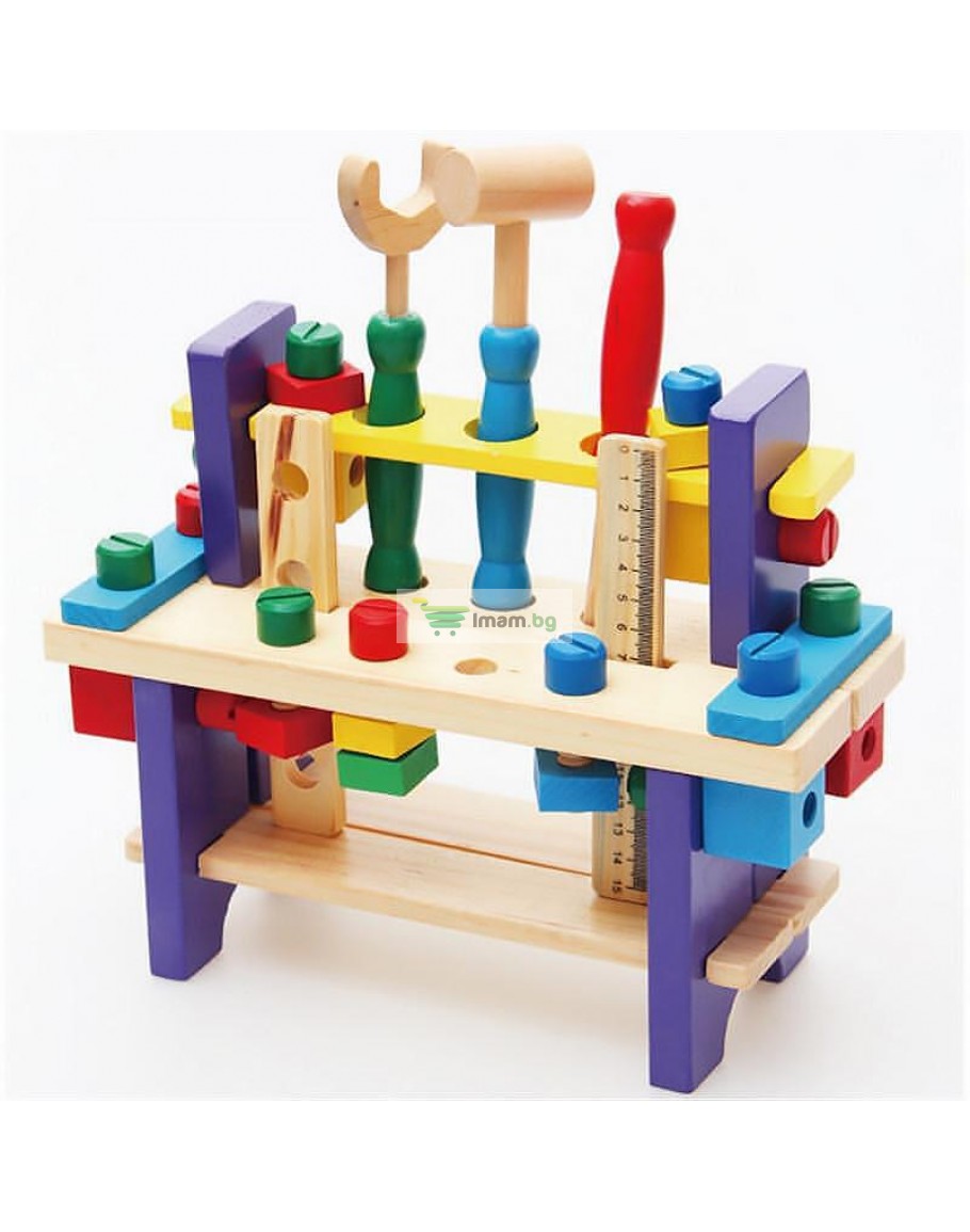 Детската дървена маса с инструменти е малка, но функционална работилница, създадена специално за малките майстори. Тя предлага стабилна маса за работа, място за окачване на инструменти и разнообразни елементи като гайки, чук, гаечен ключ, трион и други, които вдъхновяват детското въображение и насърчават активната игра.