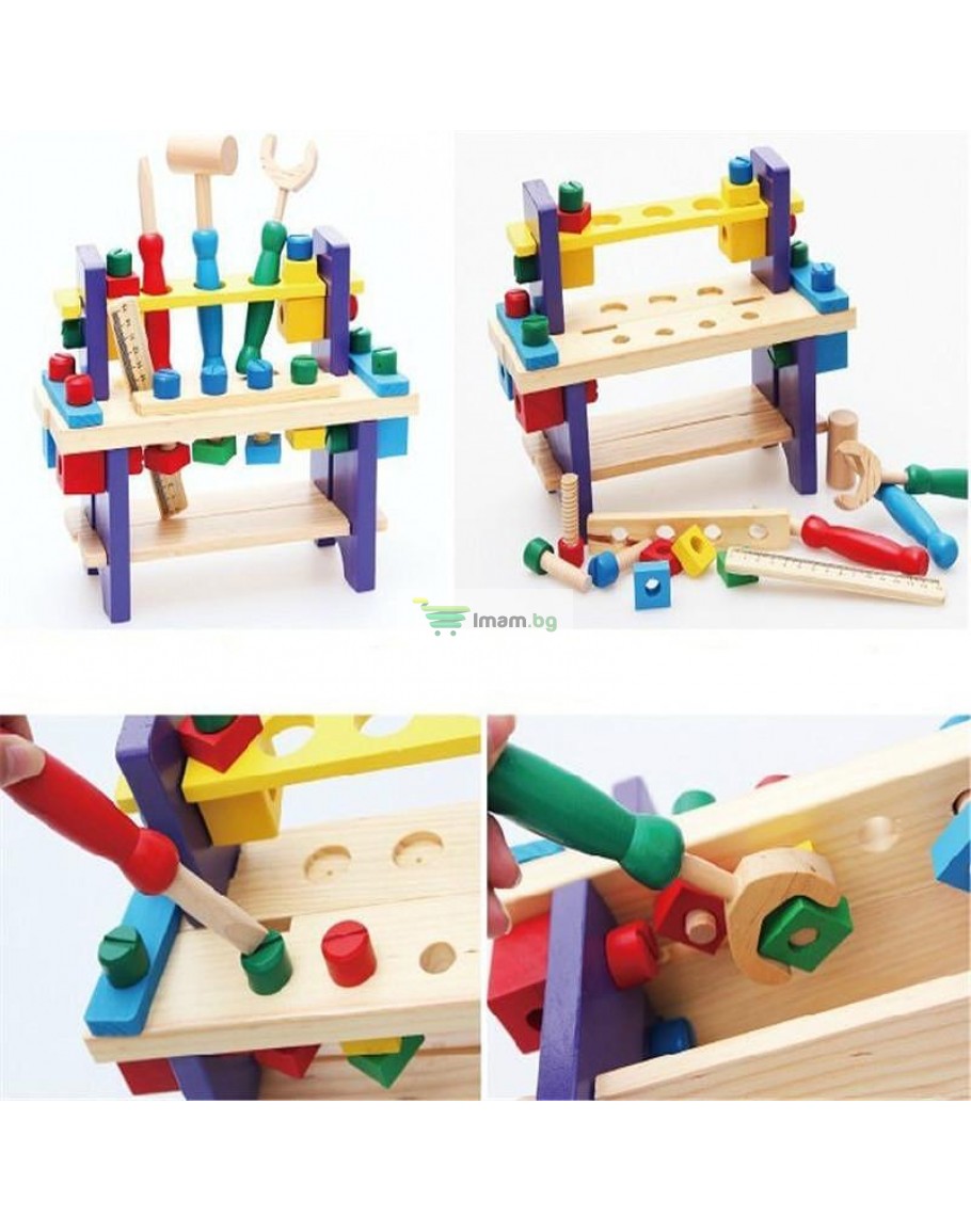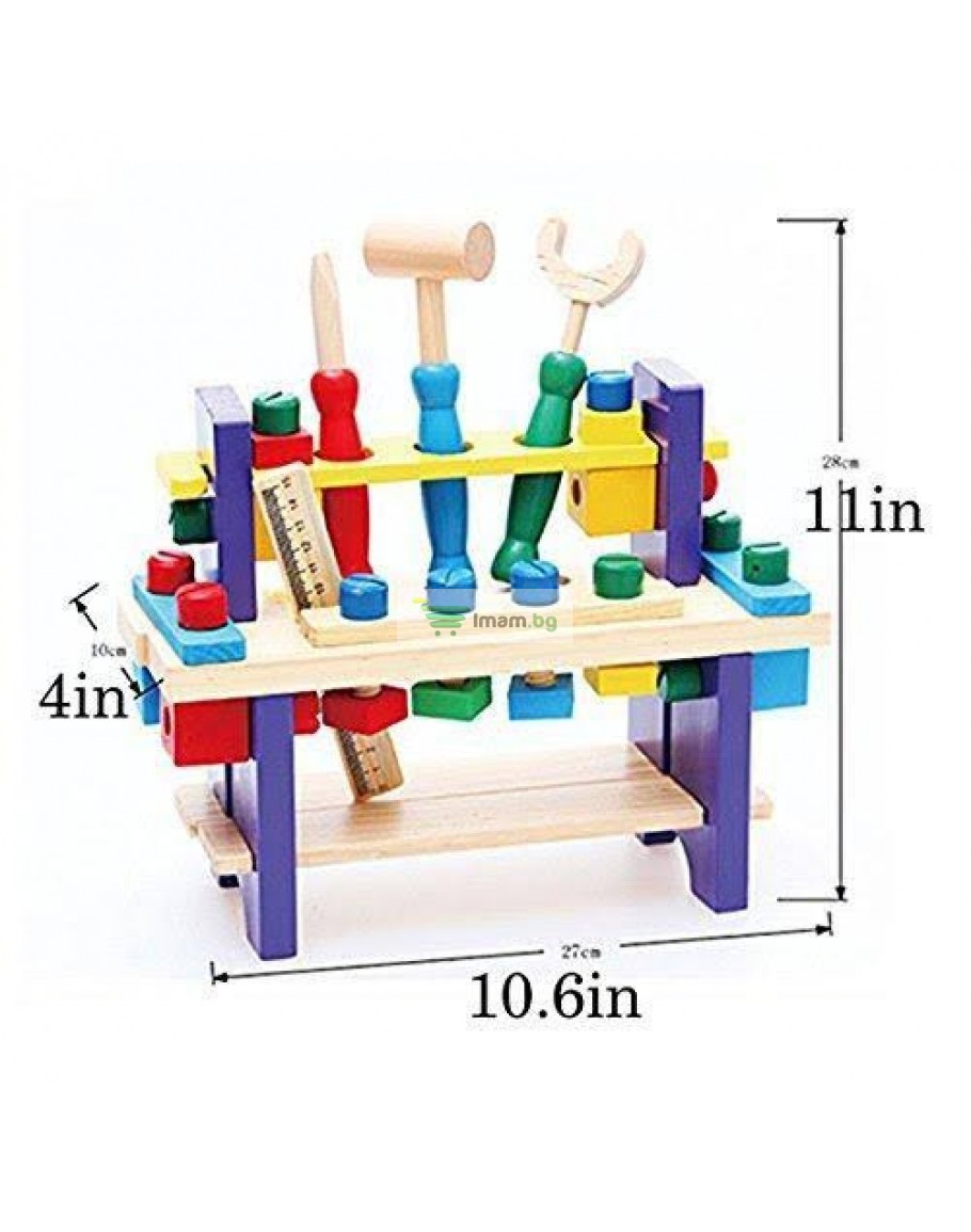 Съдържа: Работна маса, чук, трион, гаечен ключ, гайки и други аксесоари