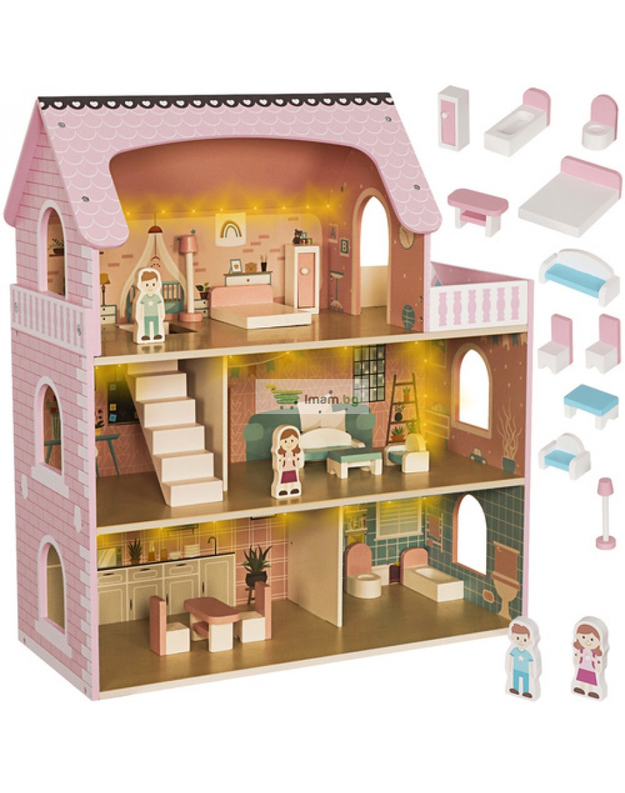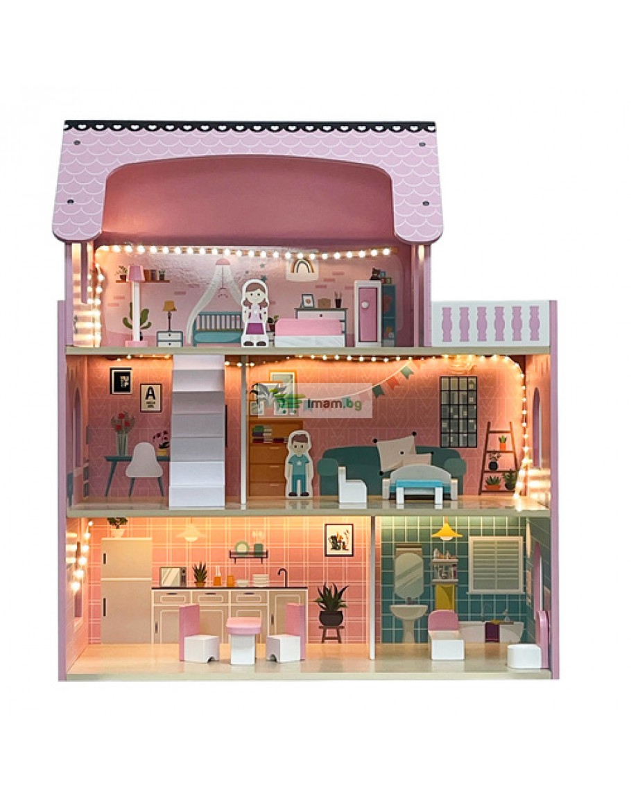 Дървена къщичка за кукли LED осветление и аксесоари
