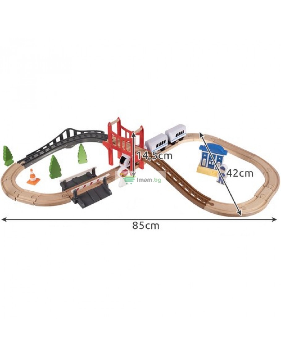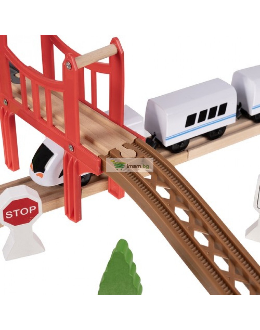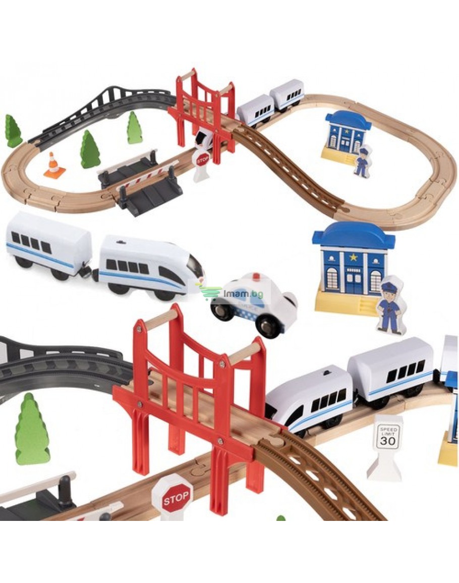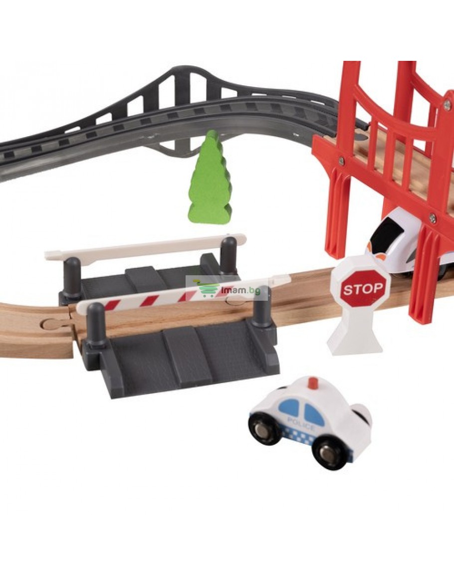 доминиращ материал: дърво, други: PP + ABS + желязо + магнит) в комплекта - 20 елемента релси, 5 дървета, 2 знака, 2 бариери, 1 пътнически влак, 1 полицейска сграда, 1 играчка кола, 1 пътен конус, 1 фигурка