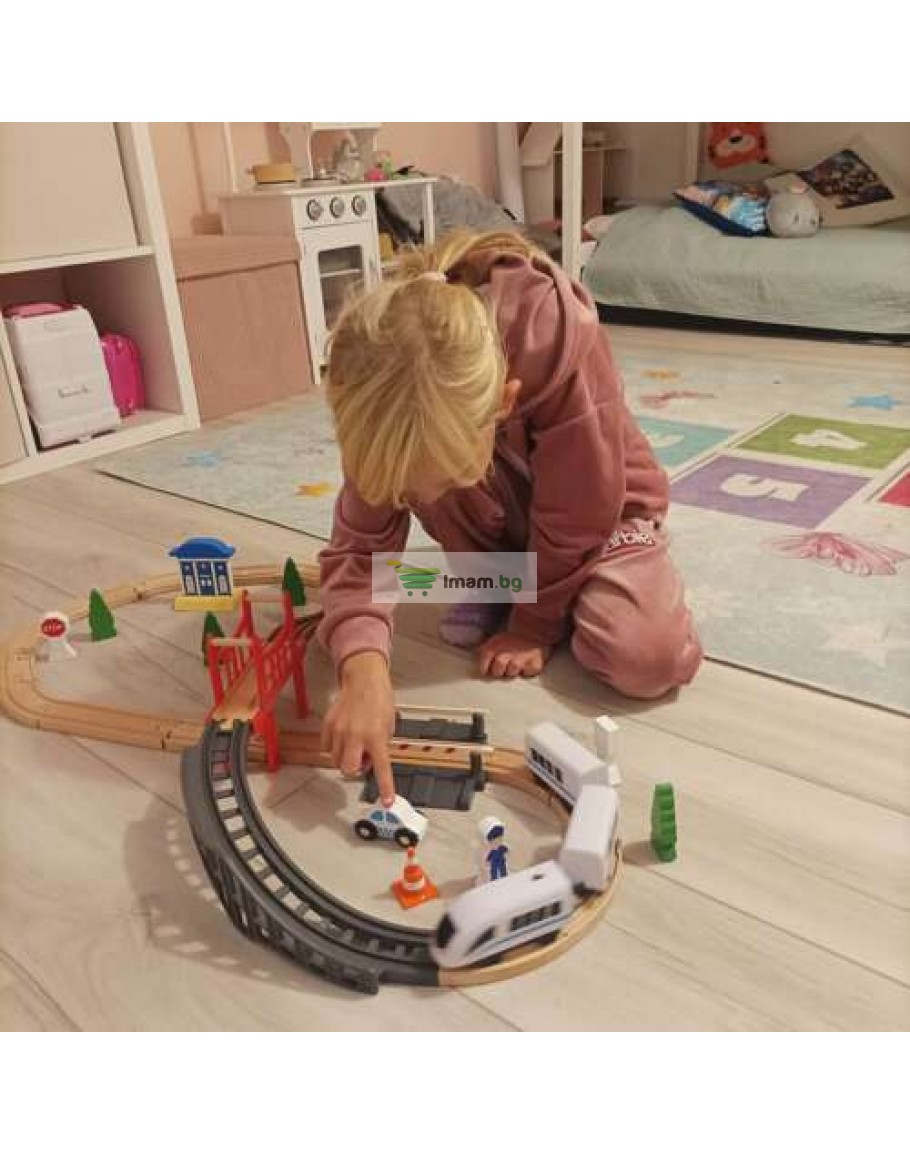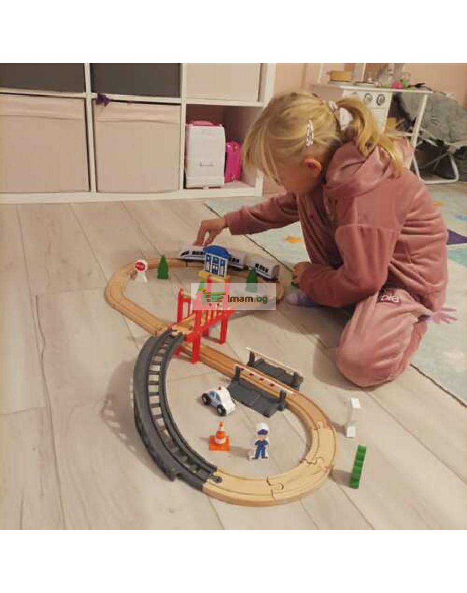 37 ЕЛЕМЕНТА – комплектът се състои от 37 прецизно изработени и красиво завършени елемента, които могат да бъдат аранжирани според вашата идея . Комплектът включва, наред с други неща, пътническа влакова линия, полицейска кола, комплект дървета и знаци, полицай, знаци и много други. Елементите на влака и железопътната линия са свързани с магнити - няма излишни кукички, които биха могли да се счупят и да създадат на детето постоянен проблем с разделянето на комплекта. Магнитите са силни - те не се пускат, дори когато целият комплект се повдигне.