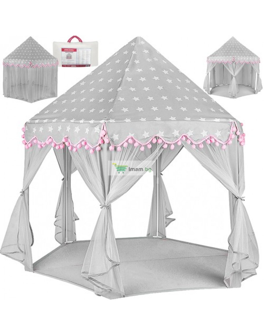 АТРАКТИВЕН ВЪНШЕН ВИД – палатката е визуално интересна. Има шестоъгълна основа, 6 входни отвора и покрив във формата на пирамида. Играчката е с атрактивен външен вид, а цветът на корицата добавя естетическа стойност.
