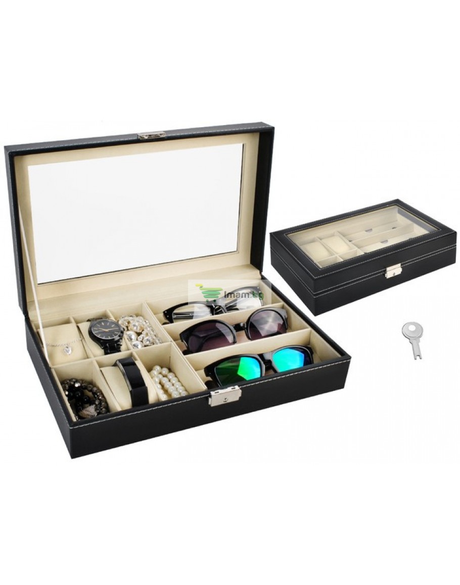 ЕСТЕТИЧЕН И ЕЛЕГАНТЕН - калъф , изработен с внимание към детайла, изглежда красиво и чудесно показва съдържанието си. Продуктът е изработен от черна екокожа с бели шевове и ярък, перфектно контрастиращ интериор. Капакът на калъфа е прозрачен, така че можем да използваме кутията за часовници и очила не само за съхранение и поддържане на ред, но и за елегантно показване на съдържанието.