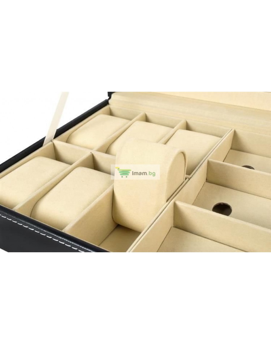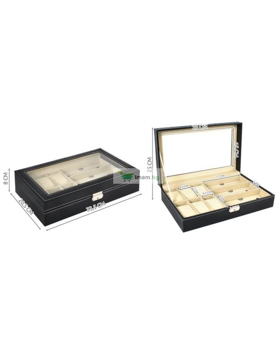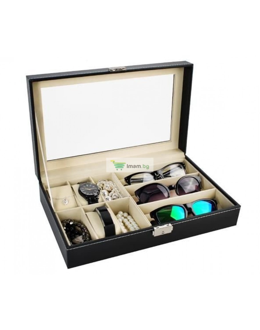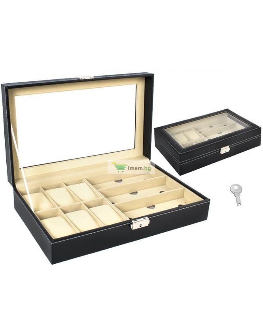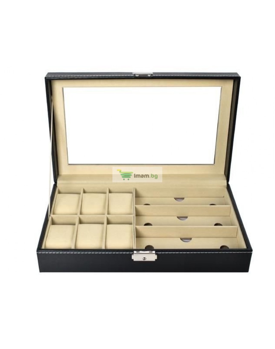 СПЕЦИФИКАЦИЯ - материал: външен капак: полиуретан + стъкло, структура: дървесно-влакнеста плоскост със средна плътност, други елементи: найлон, нетъкан текстил, фланел, полипропилен, пяна, хартия, картон, метални елементи; цвят: черен; брой отделения: 6 за часовници + 3 за очила; максимална височина в разгънато състояние: 25 см; размери на малкото отделение (дължина/ширина): 7/4,5 см; размери на голямото отделение (дължина/ширина): 6/17 см; 0,917 кг; тегло в опаковка: 1,2 кг.