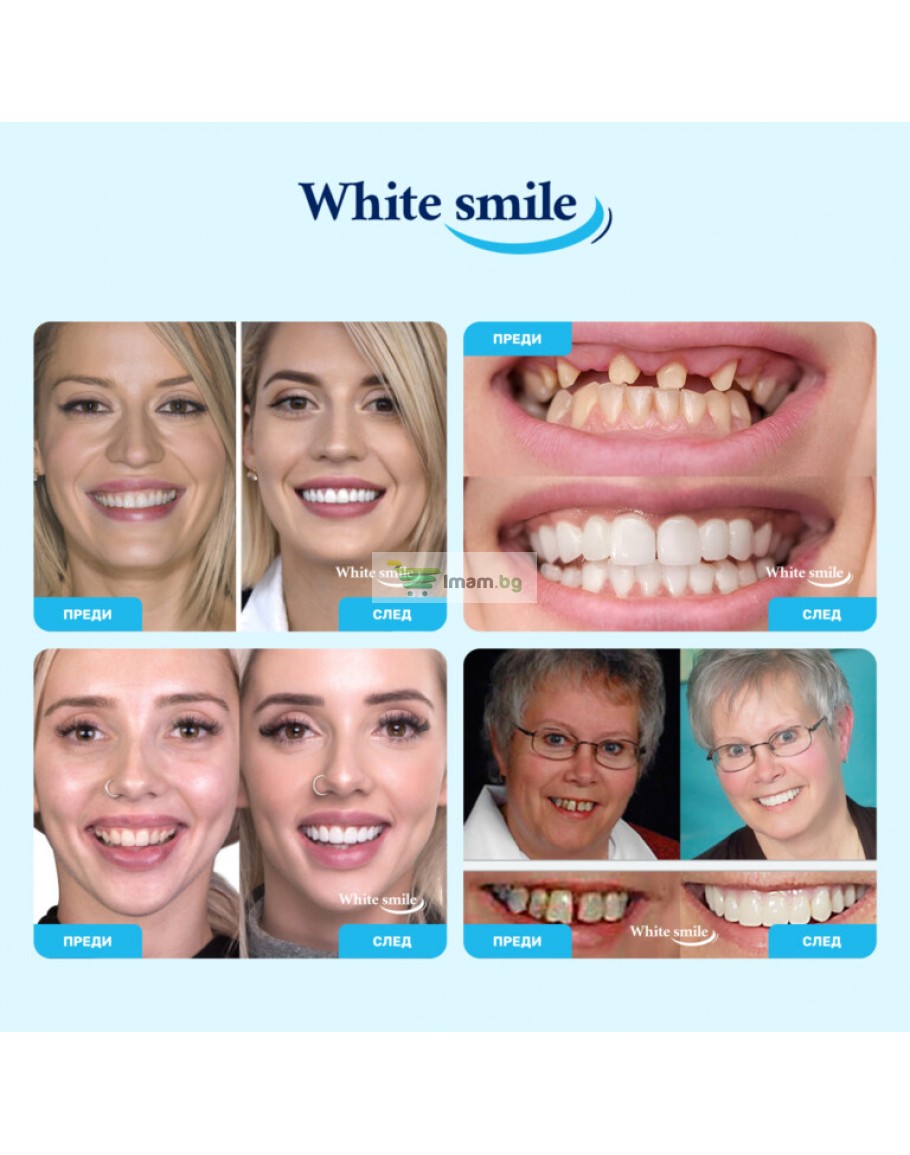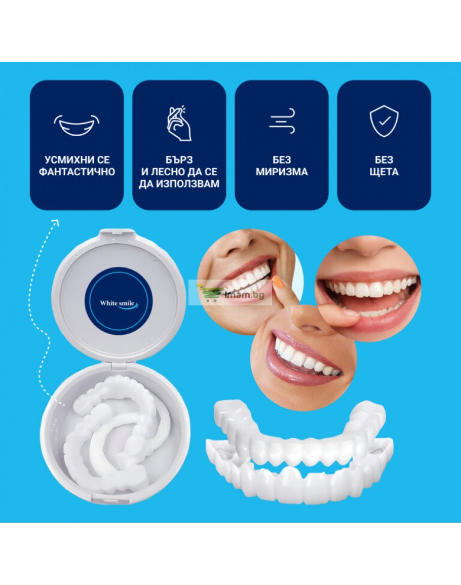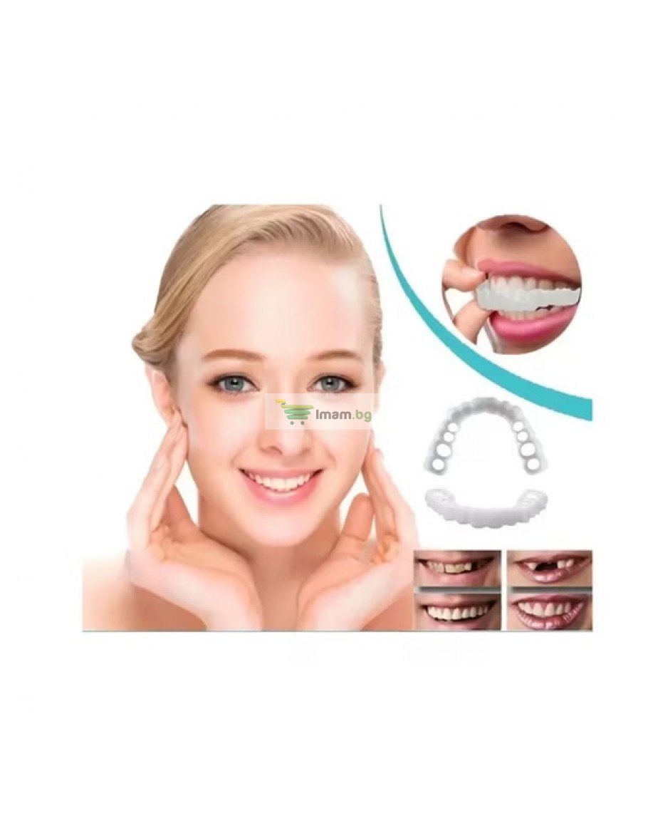 Начин на употреба: Потопете силиконовите зъби в топла вода за няколко секунди, за да станат гъвкави. Поставете ги внимателно върху естествените си зъби и ги нагласете за удобство. Усмихнете се уверено!