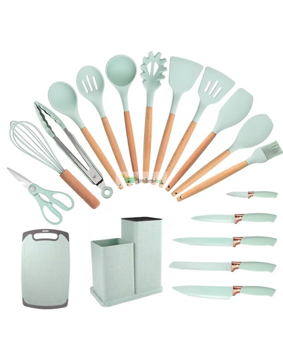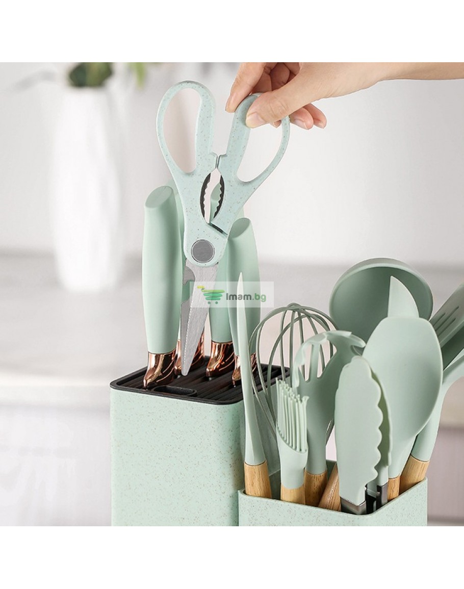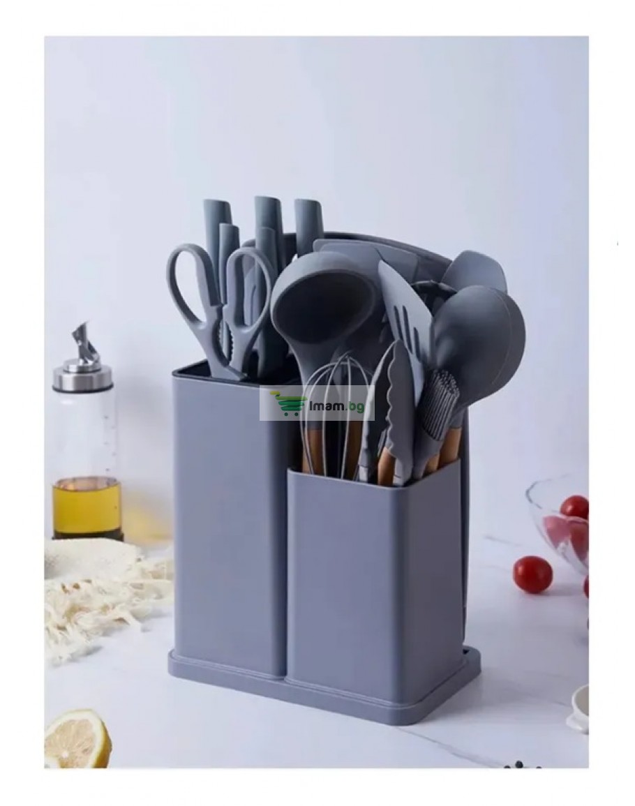 К-т силиконови прибори 33 части със стойка ножове, ножица и дъска