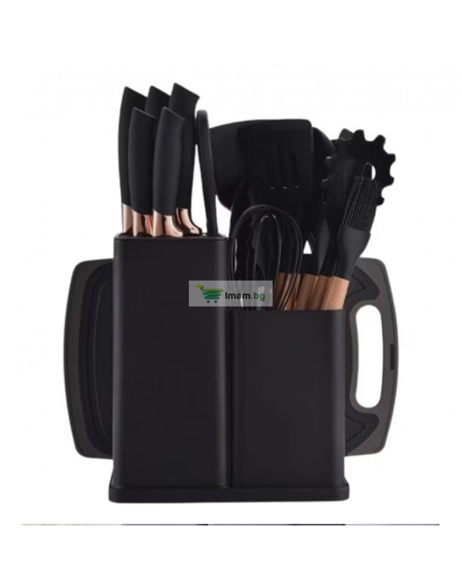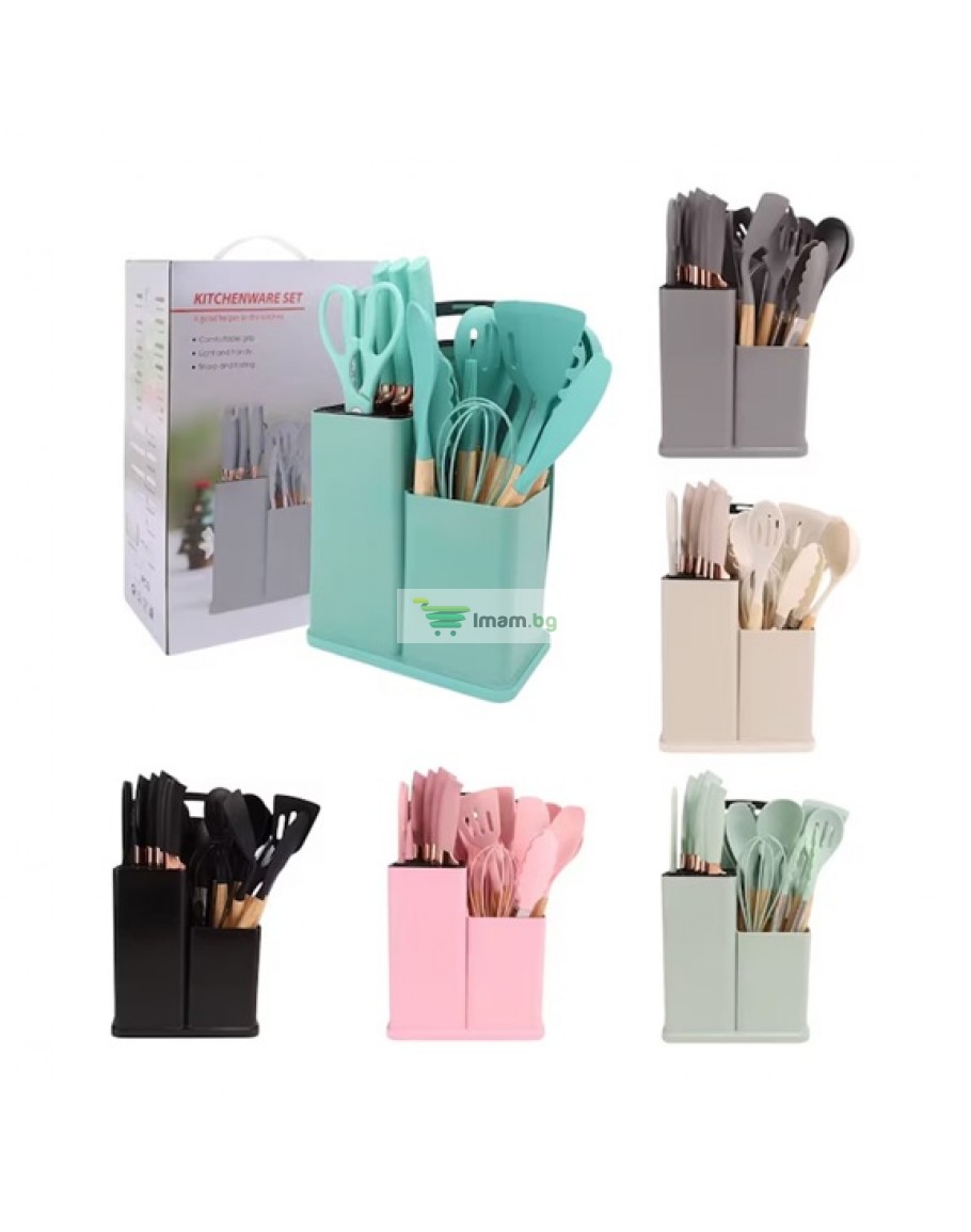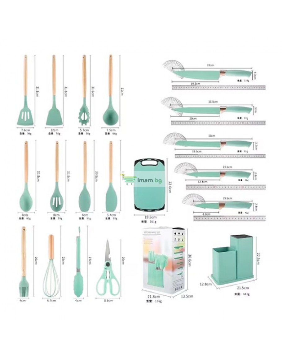 К-т силиконови прибори 33 части със стойка ножове, ножица и дъска
