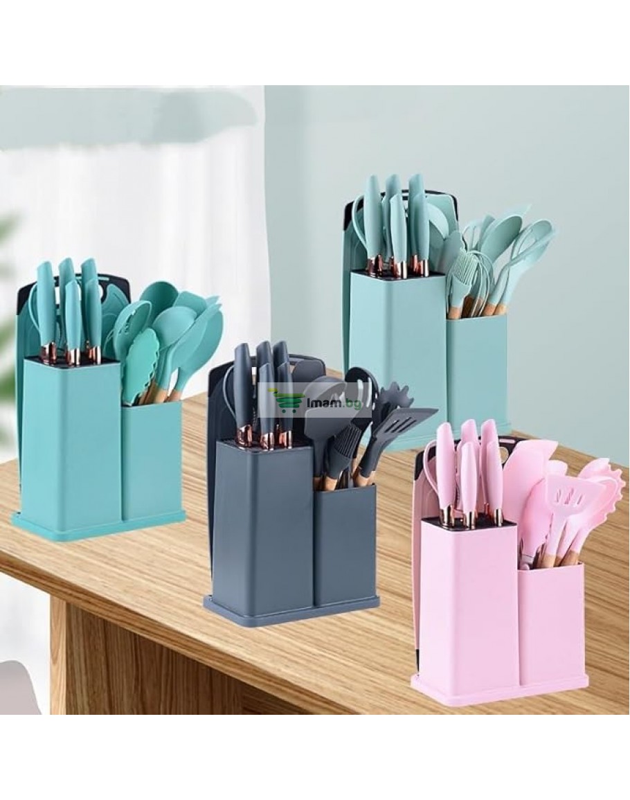 Включва основни прибори като шпатули, лопатки, четки за полиране, щипки, както и комплект перфектно остри ножове от неръждаема стомана. Всички те са организирани в компактна и естетична стойка, която заема малко място и предлага модерен вид на всяка кухня.