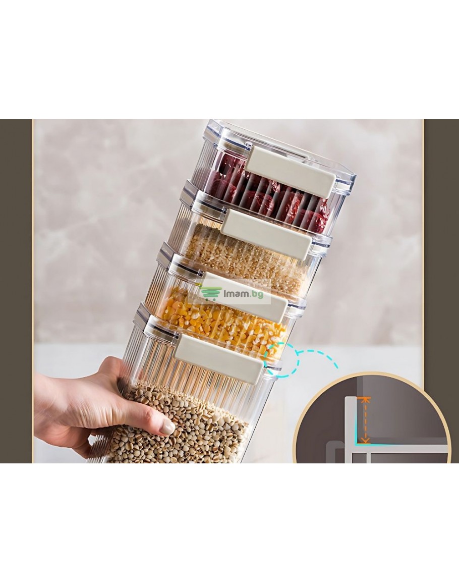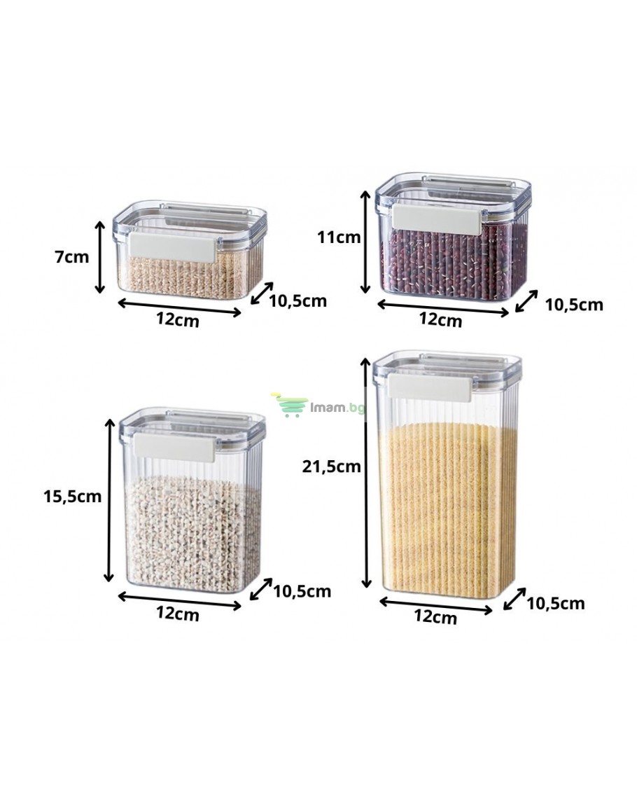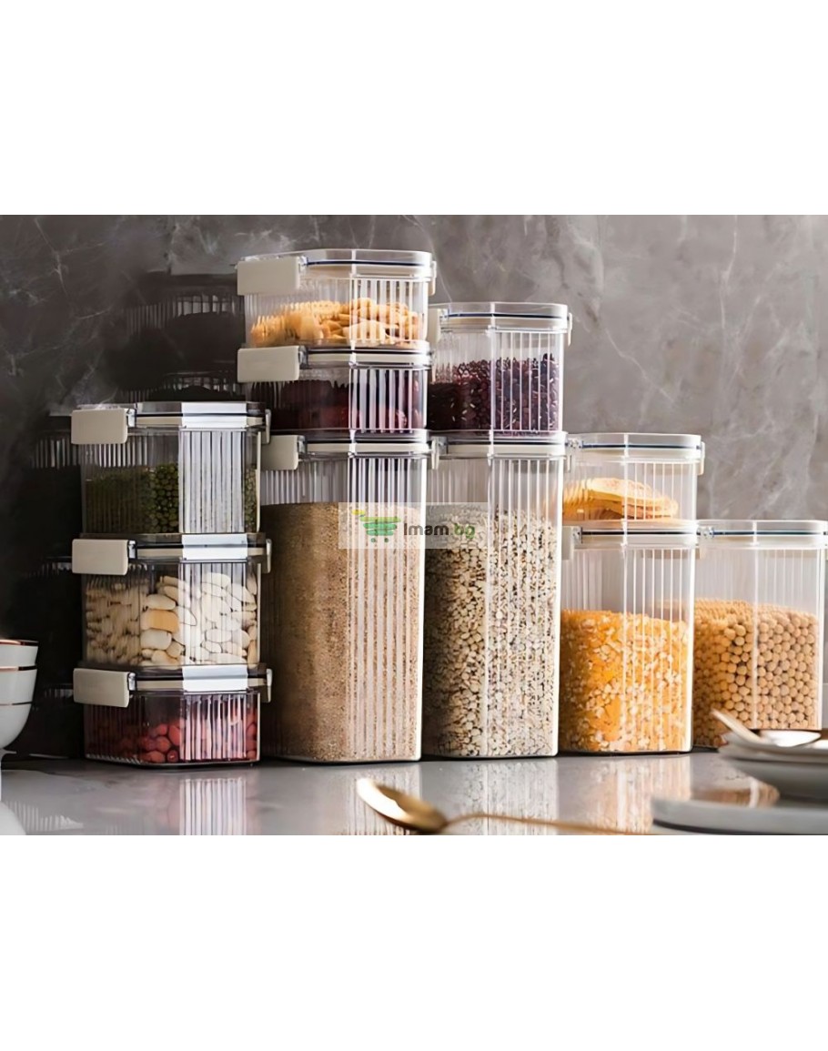 Всеки контейнер е снабден със здрав капак със силиконово уплътнение , което предпазва продуктите от влага, насекоми и загуба на свежест. Това запазва храната свежа за по-дълго време и вашата кухня подредена. Контейнерите са изработени от висококачествена пластмаса, която е устойчива на напукване и лесна за почистване.