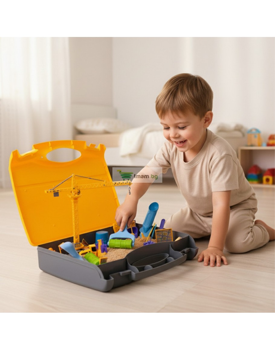 Комплект за строителство - мобилна пясъчник в куфар: мобилен кран, строителни машини, формички и аксесоари за безпроблемна творческа игра; сензорно и моторно развитие