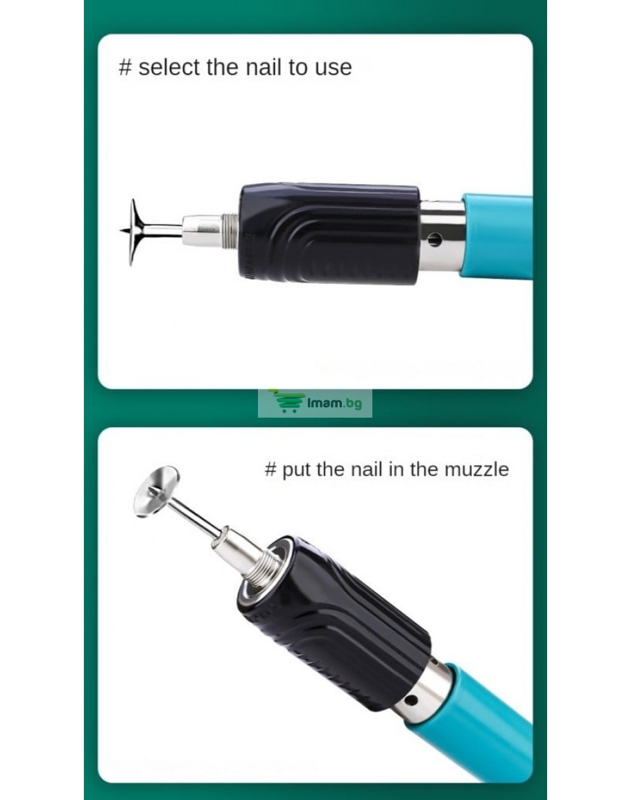 Поддръжка на различни размери пирони: Пистолетът позволява използването на множество размери пирони, което го прави подходящ за разнообразни проекти.
