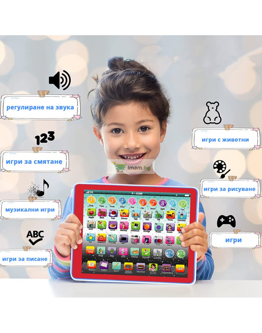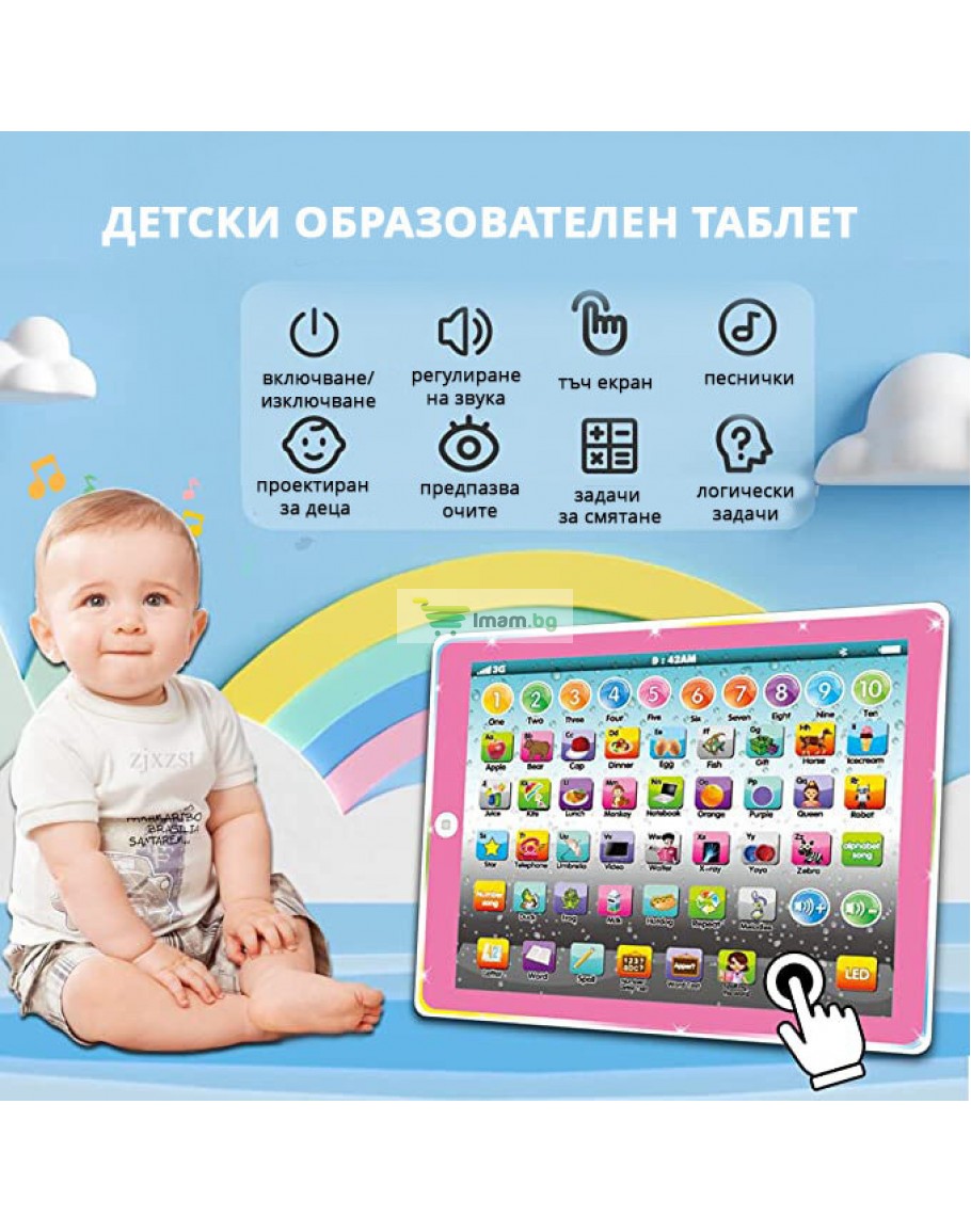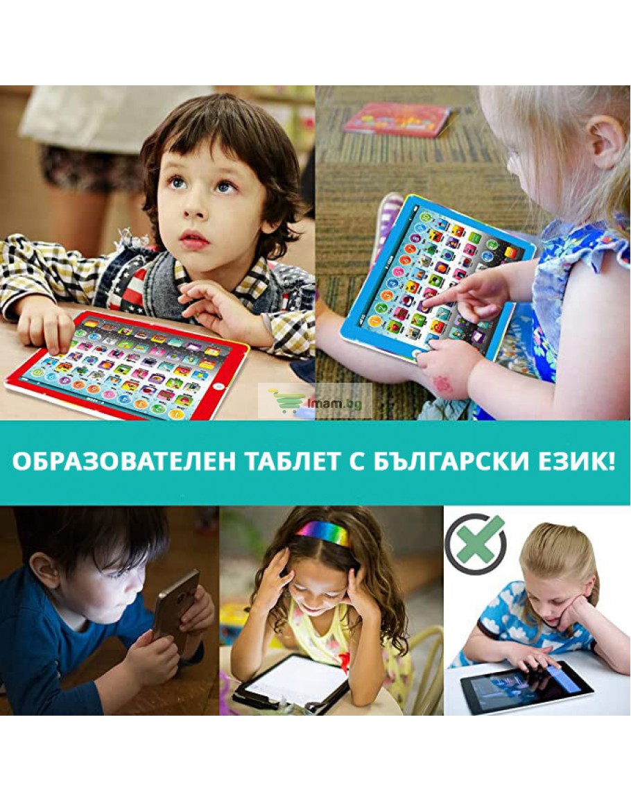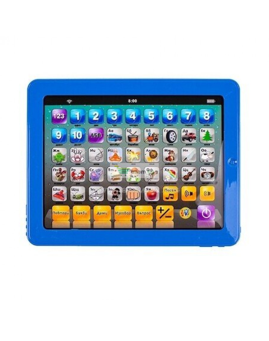 Обучаващият таблет на Български ще помогне на Вашето дете да се научи да разпознава и изговаря правилно буквите от българската азбука. Детската играчка ще обучава и изпитва детето Ви изцяло на Български език и ще му помогне да мисли логически. Освен откриването на думи, букви и цифри, образователния таблет предоставя и възможност за пресмятане и събиране, което допълнително ще развие способностите на малчугана.