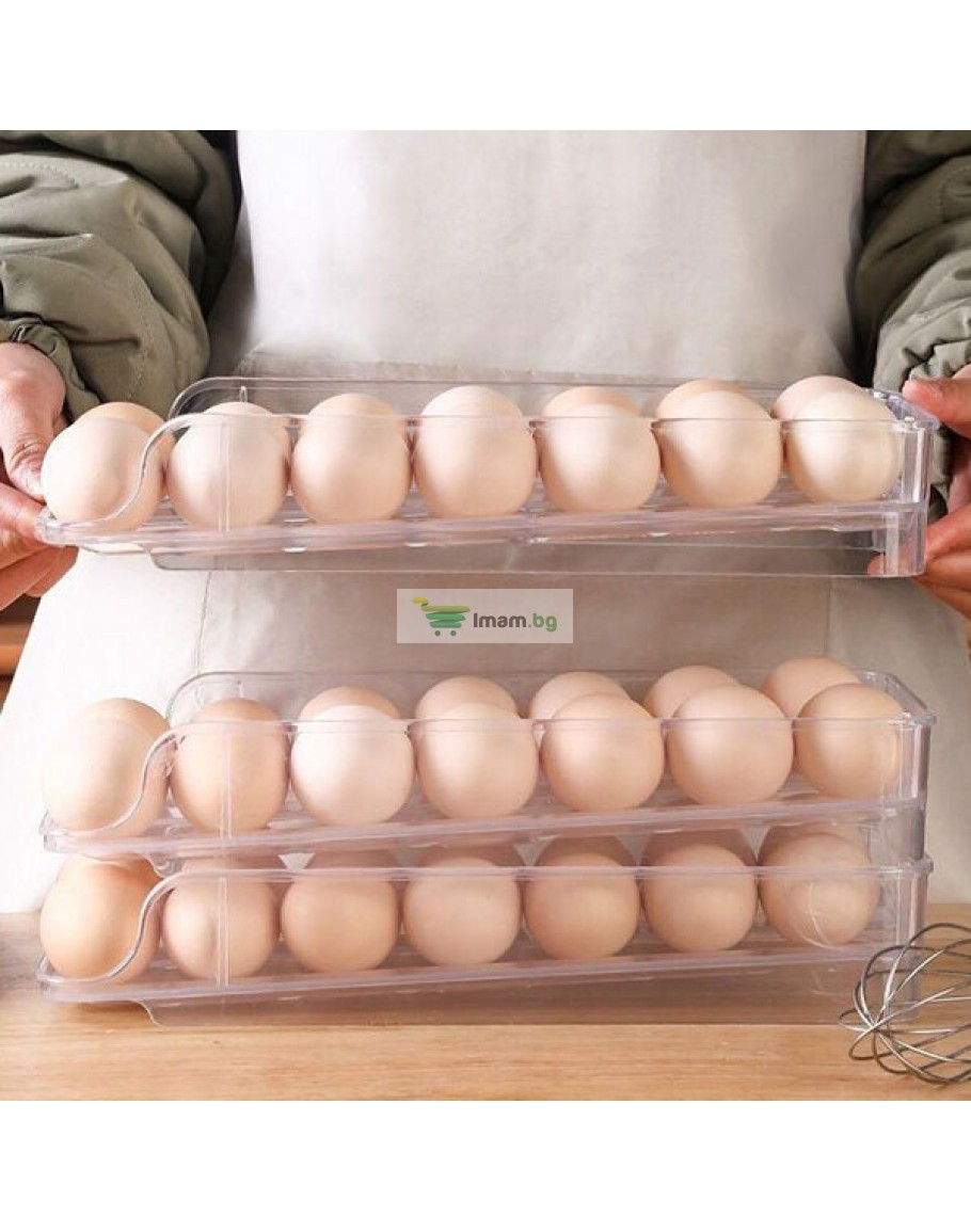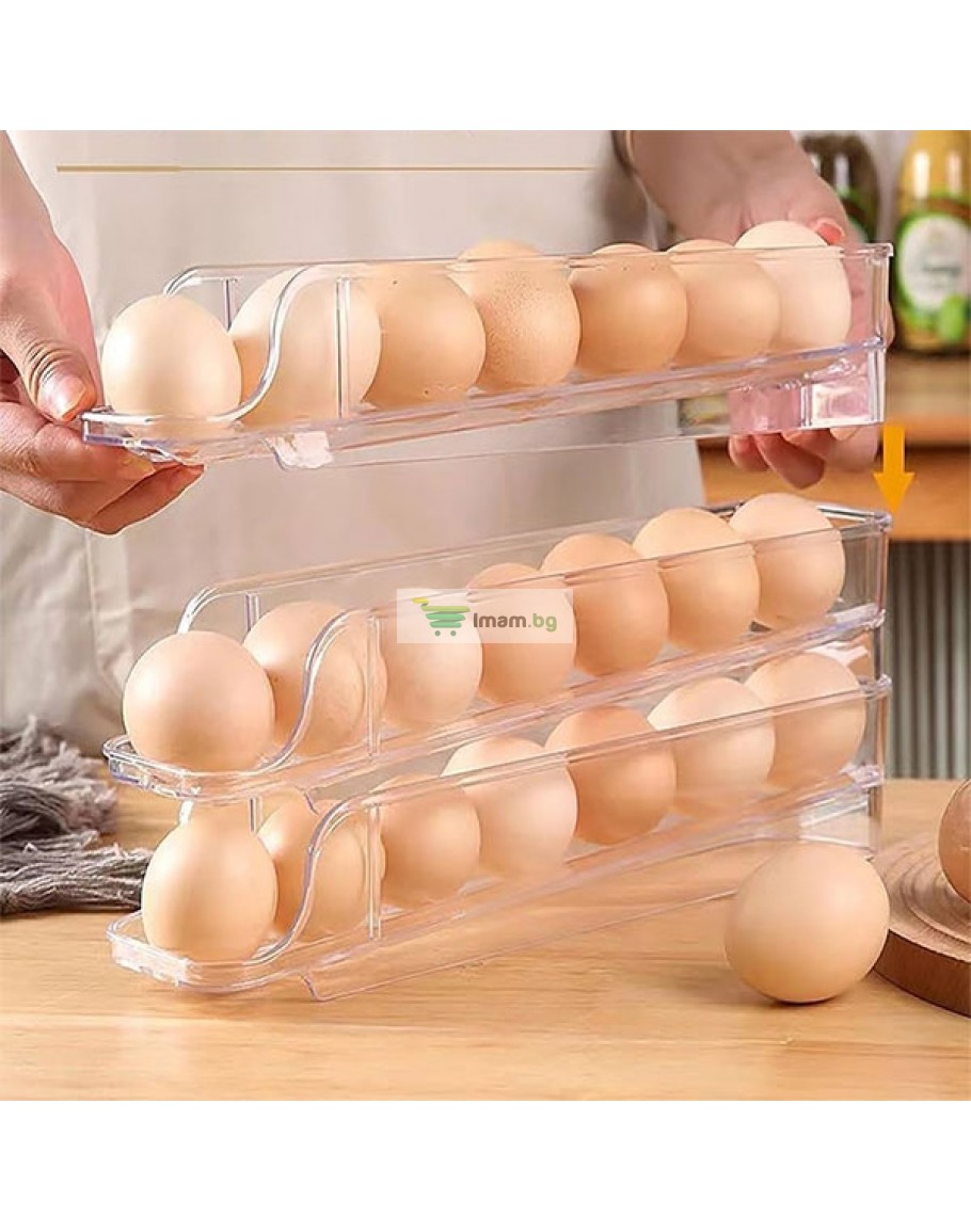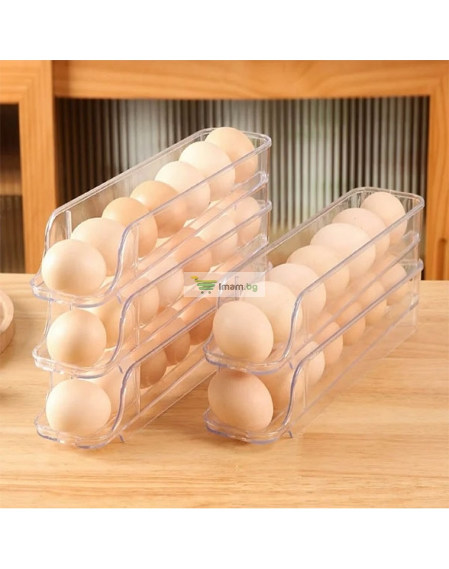 Елегантна и функционална, тази прозрачна стойка за яйца е идеалното решение за поддържане на ред в хладилника. Модулният дизайн с три нива позволява автоматичното плъзгане на яйцата напред, което осигурява удобен достъп и оптимално използване на пространството. Изработена от устойчив прозрачен материал, тази поставка позволява лесно следене на количеството яйца, а компактната ѝ форма се вписва перфектно както в кухненски шкафове, така и в хладилника.