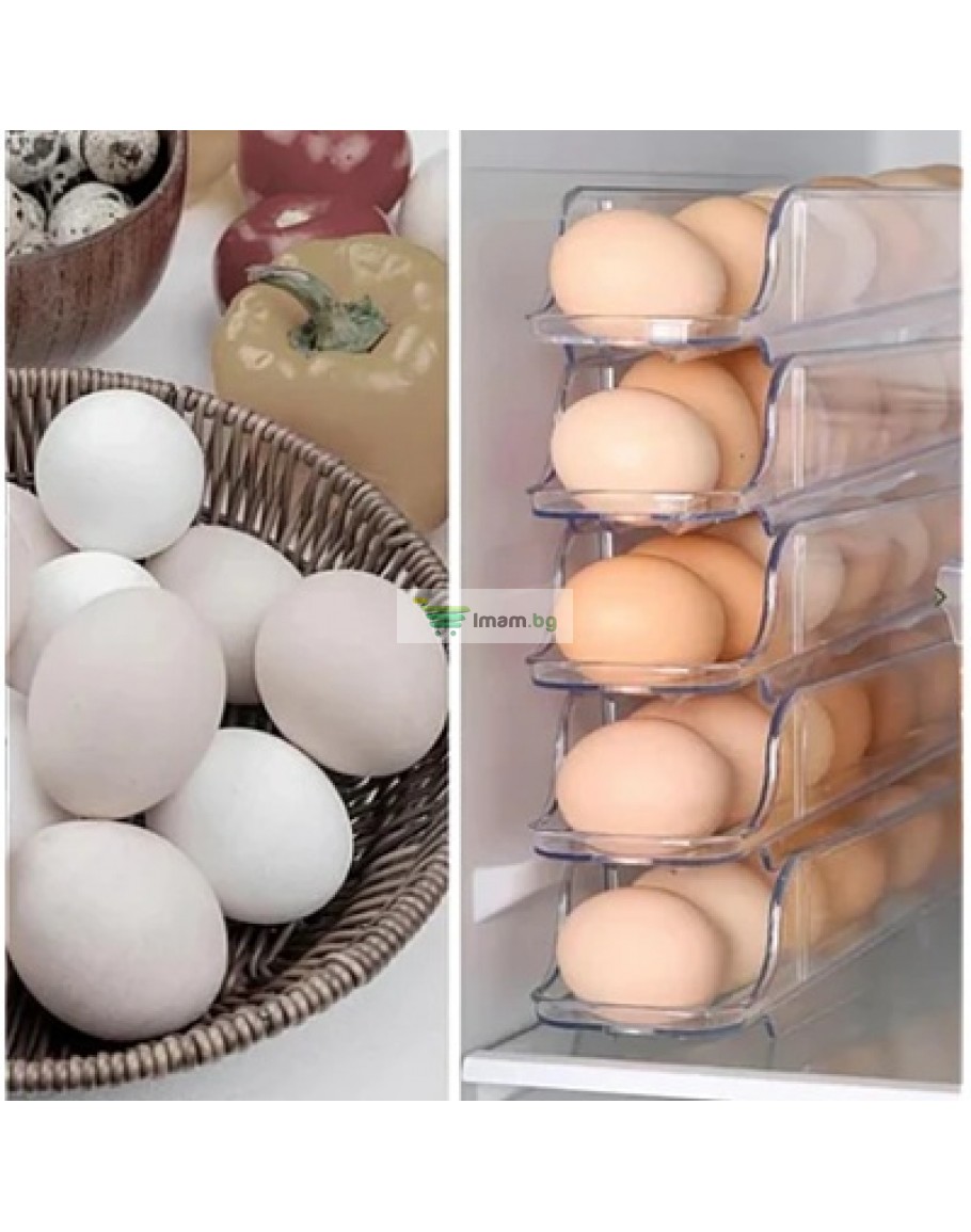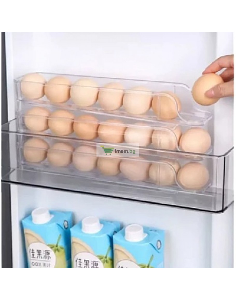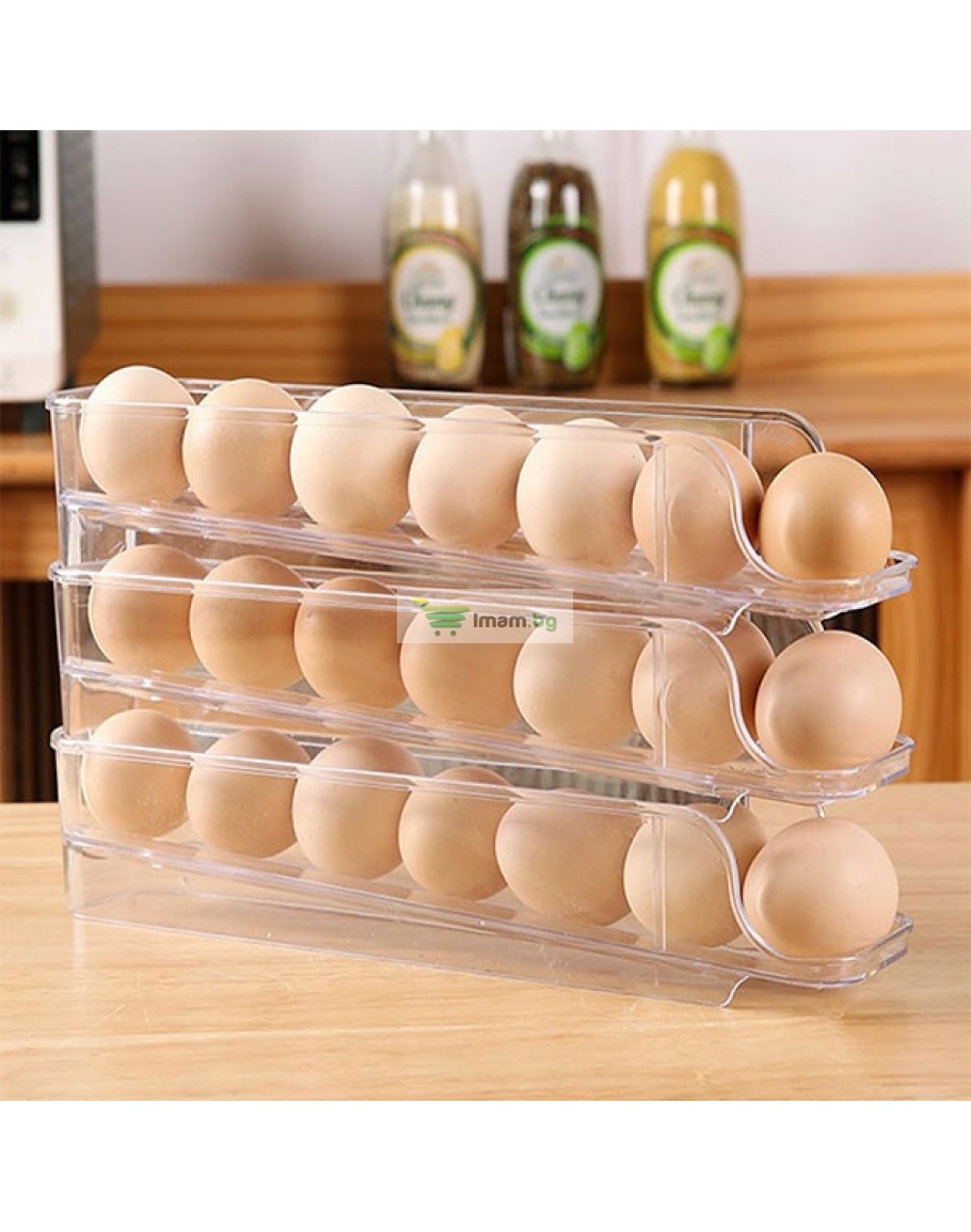 Елегантна и функционална, тази прозрачна стойка за яйца е идеалното решение за поддържане на ред в хладилника. Модулният дизайн с три нива позволява автоматичното плъзгане на яйцата напред, което осигурява удобен достъп и оптимално използване на пространството. Изработена от устойчив прозрачен материал, тази поставка позволява лесно следене на количеството яйца, а компактната ѝ форма се вписва перфектно както в кухненски шкафове, така и в хладилника.