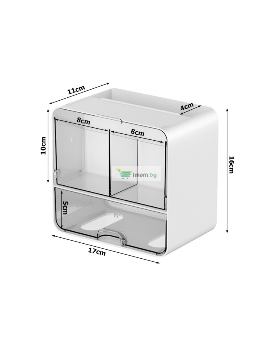 Контейнерът може лесно да се постави на бюро, в шкаф или на стена в банята, осигурявайки ред и удобство там, където най-много ви е необходимо. Благодарение на възможността за закрепване към стената с лепило, вие спестявате ценно място на плотовете си и получавате лесен достъп до ежедневни продукти. Този начин на монтаж е бърз, неинвазивен и не изисква използването на инструменти. Това е идеалното решение за хора, които ценят реда и функционалността без компромис.