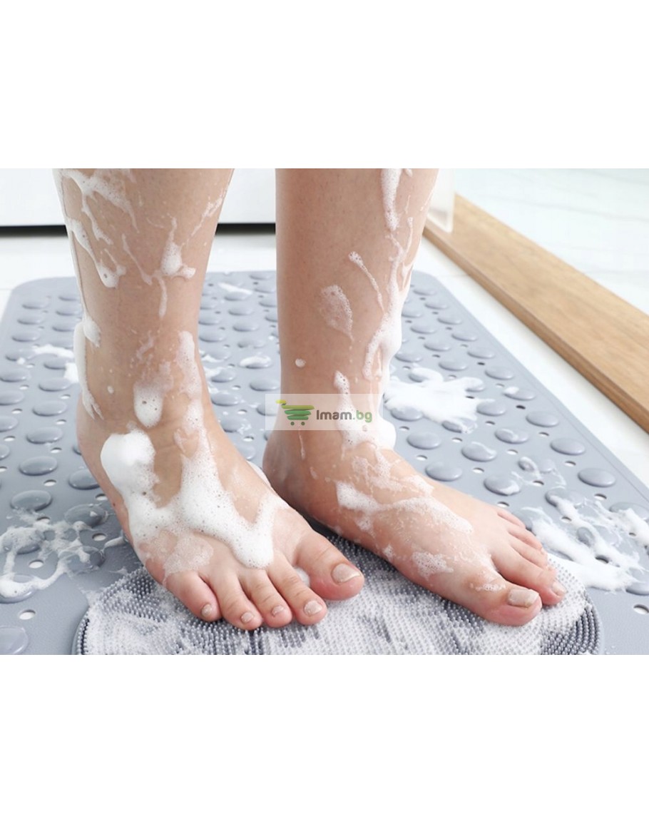 Вдлъбнатините по цялата повърхност на постелката нежно масажират краката ви, докато стоите прави , подобрявайки комфорта. Допълнителна зона с фини влакна улеснява старателното измиване на краката ви, без да се налага да се навеждате – просто добавете сапун или гел.