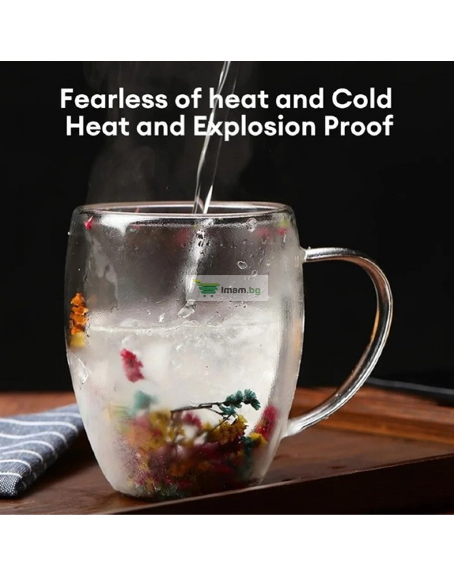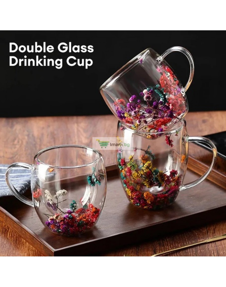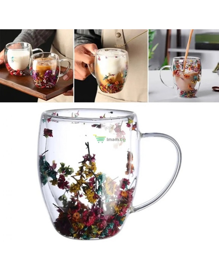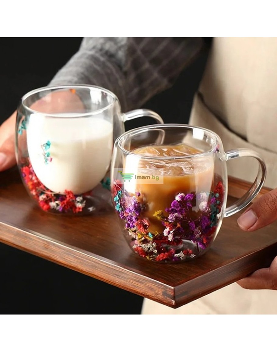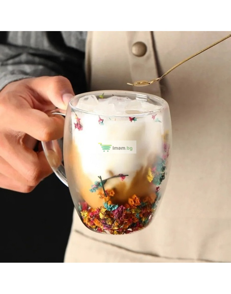 Стъклена чаша двойна с естествени цветя за кафе и чай 250 мл