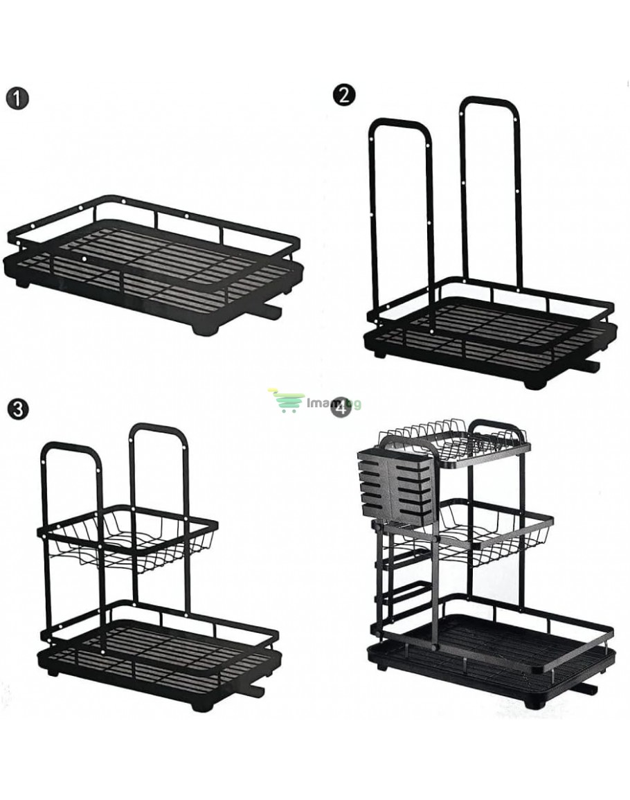 Поставка за сушене на съдове, комплект от подвижна многослойна поставка за съдове и дъска за отцеждане, органайзер с държач за прибори (3 нива)