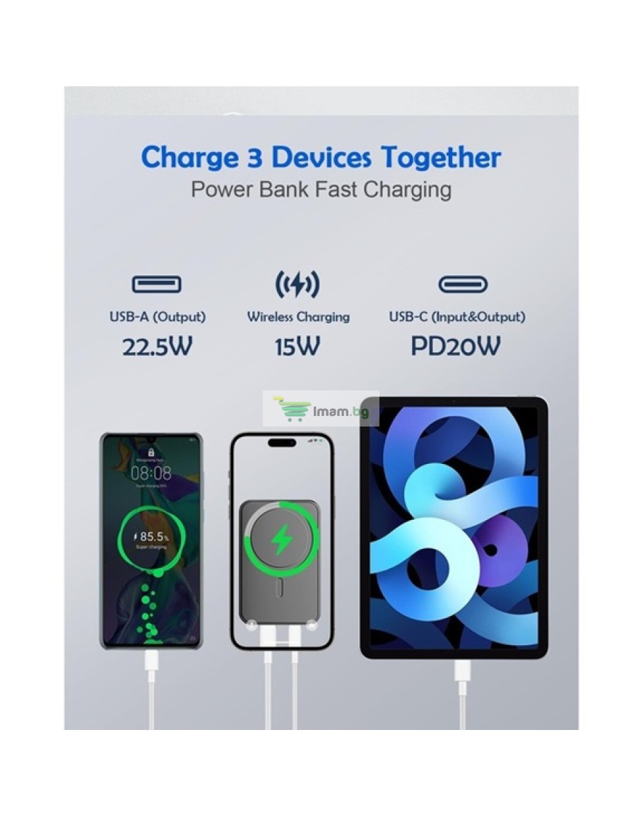 Може да зарежда три устройства (безжична външна батерия, Type-C, USB A) едновременно, ефективно и практично. Съвместима с повечето мобилни телефони, таблети и други електронни устройства на пазара, което перфектно спестява време за зареждане.