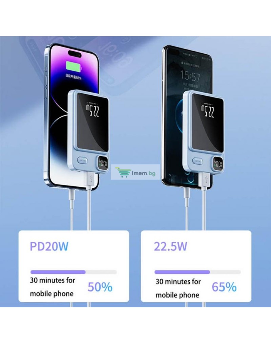 Тази външна батерия е оборудвана и с USB изход до 22,5 W и Type-C изход 22,5 W PD/QC3.0. С кабела за бързо зареждане телефонът може да бъде зареден до 60% за 30 минути.